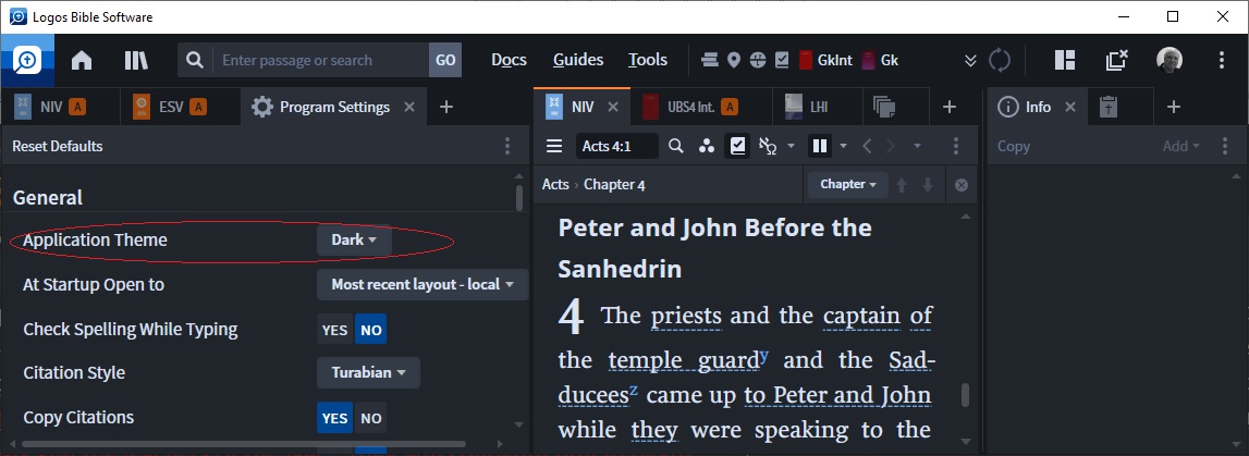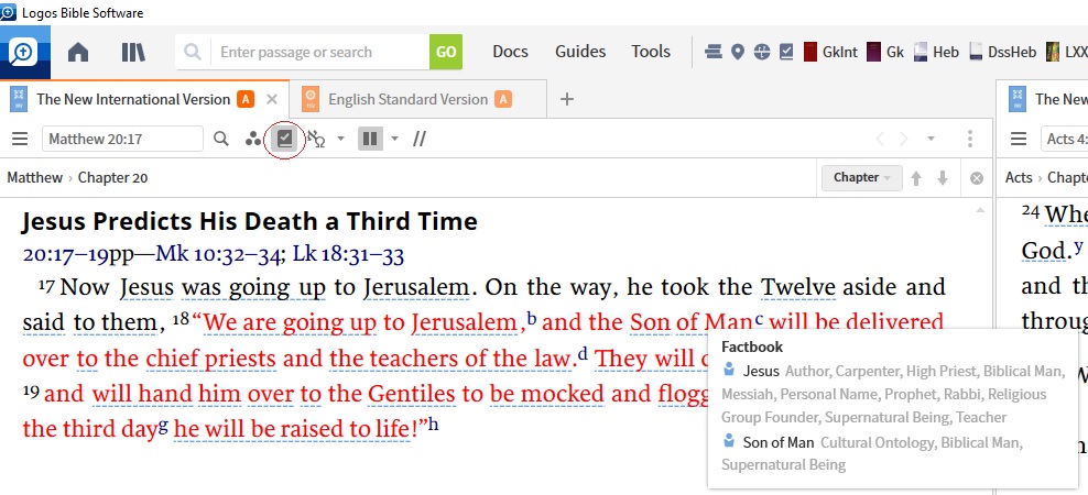 If you’d like the software to provide background information as you read Scripture, you’ll appreciate the updated Factbook. Hovering the mouse over any underlined word/phrase pops up the Factbook entry, e.g. “Son of Man” in the screenshot below. If this interrupts your reading, turn the Factbook visual filter off (icon circled in red in the screenshot):