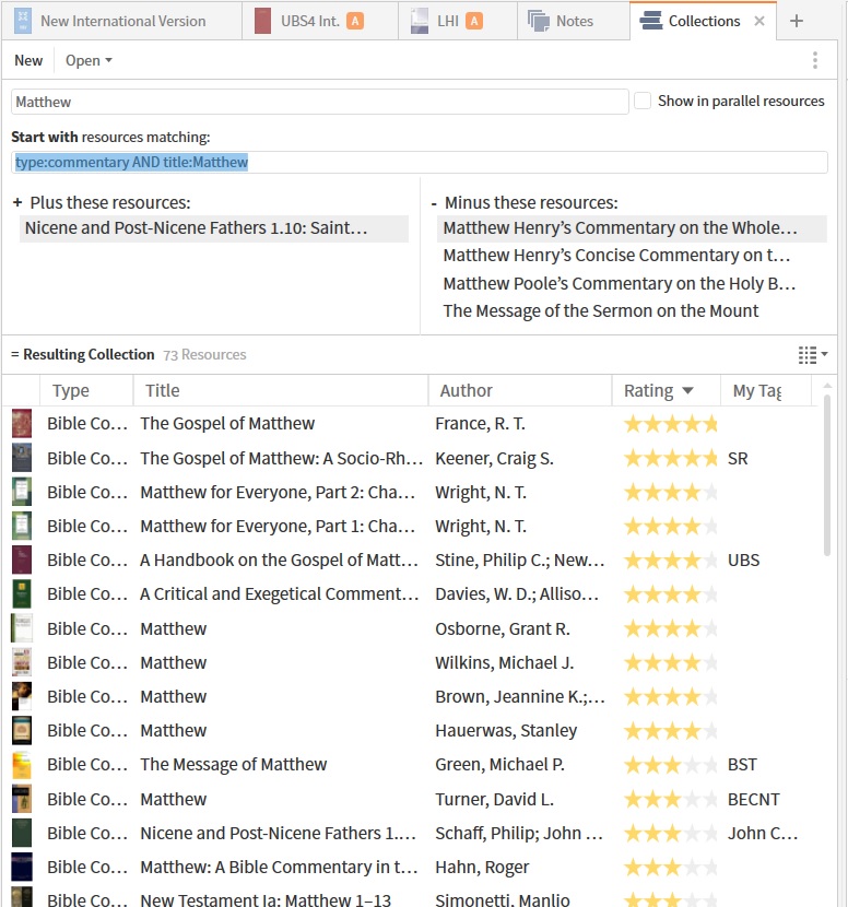 After translating, I want to understand what others say about this text. You could use the built-in Passage Guide, but I created a Collection of commentaries on Matthew, sorted by how I rate them. Clicking any entry opens that commentary to the text I’m working on, or I can search the collection for a phrase such as “suffering Son of Man”.