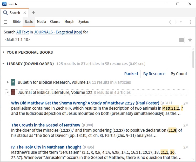 I also have a Collection for journals I find helpful for exegetical work, so I can search for journal articles that refer to a passage such as <Matt 21:1-10>. Where Kindle would return only an exact text match, the tagging in Logos means it recognizes 21:9 as in the range:
