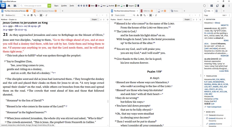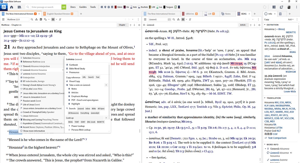 Right-click any word (e.g. Hosanna) for a myriad of options such as opening a dictionary or a lexicon. Naturally the choices available depend on what books you’ve bought.